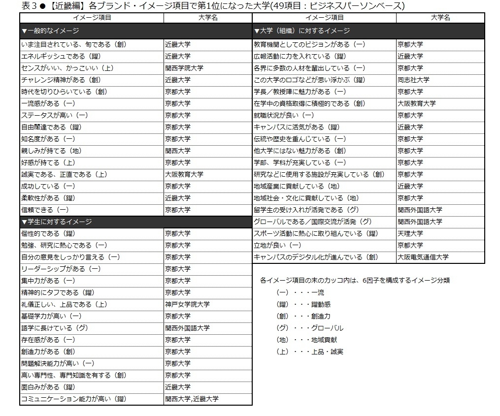 49項目のイメージを因子分析(※1)によって、関連性の高いイメージ群を6つの因子にグループ分けした(表4)。「躍動感(※2)」「地域貢献」因子のトップは近畿大学。2因子がトップとなる私立大学は、全9地域のうち、近畿大学のみだった。それぞれの因子を構成するイメージ項目のうち、「躍動感」因子では11項目中6項目、「地域貢献」因子では3項目中1項目で第1位を獲得した(なお、第1位を獲得しなかった項目も上位にランクインした)。