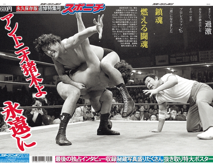 スポーツニッポン新聞社は、10月1日に死去したアントニオ猪木さんの追悼特集号を17日から順次発売します。藤波辰爾、前田日明が師・猪木さんへの思いを語った特別インタビューや、今年7月の猪木さん最後の独占インタビュー、連載「我が道」の復刻版などで、激動の人生を振り返ります。新聞2ページ分の特大ポスターも折り込みました。他にも、猪木さんを半世紀にわたって撮影してきた本紙OBでフリーカメラマン、原悦生氏の秘蔵写真をふんだんに使った永久保存版の内容です。
