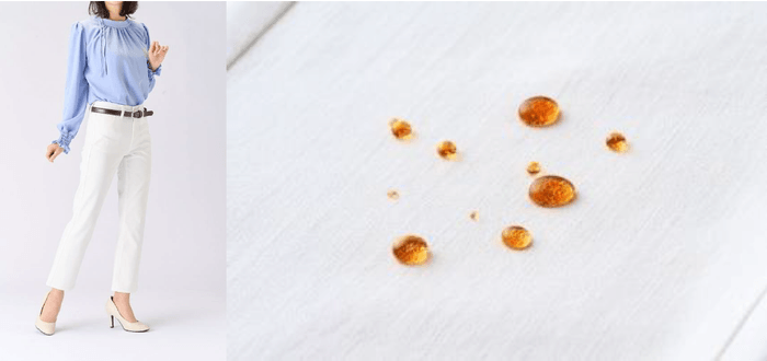 商品名の「汚れがつきにくい」秘密の正体は『防汚加工』!お茶やジュース、コーヒーなどの水溶性の汚れを弾く加工を施しているので、サッと拭くと汚れがつきにくくなっており、日常生活でも安心して着用いただけます。