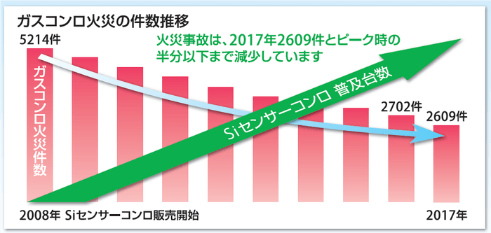 下記のグラフから分かるようにSiセンサーコンロの普及が進んでいくにつれて、火災件数については減少していき、2017年にはピーク時の半数以下となりました。(消防庁データより)