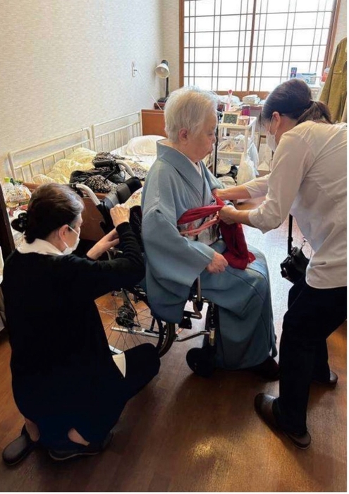 同学院では昨年9月に車いす生活の方々に、記念日やイベントの際、きものを着る楽しさを伝え、晴れやかな笑顔になっていただくことを目的にボランティア活動『車いす出張着付け』を実施し、高評価をいただきました。