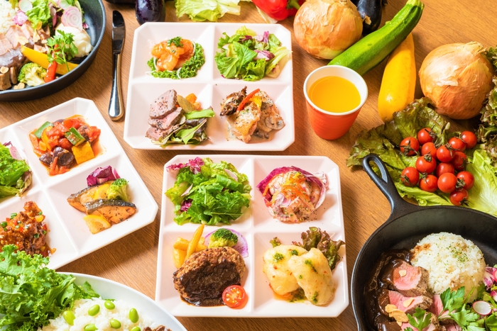 ボリューム満点な、「グリーンフォレスト デリ&カフェ」の看板メニュー。複数のデリメニューからお選びいただき、あなただけのオリジナルプレートをお楽しみいただけます。