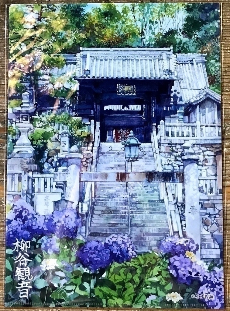 毎回作品が完売する人気画家の小木曽誠氏が柳谷観音を描いた作品を10月に銀座の画廊で発表しました。その作品を用いたクリアファイルを限定で授与します。紫陽花と柳谷観音の参道が描かれている作品です。1枚五百円。