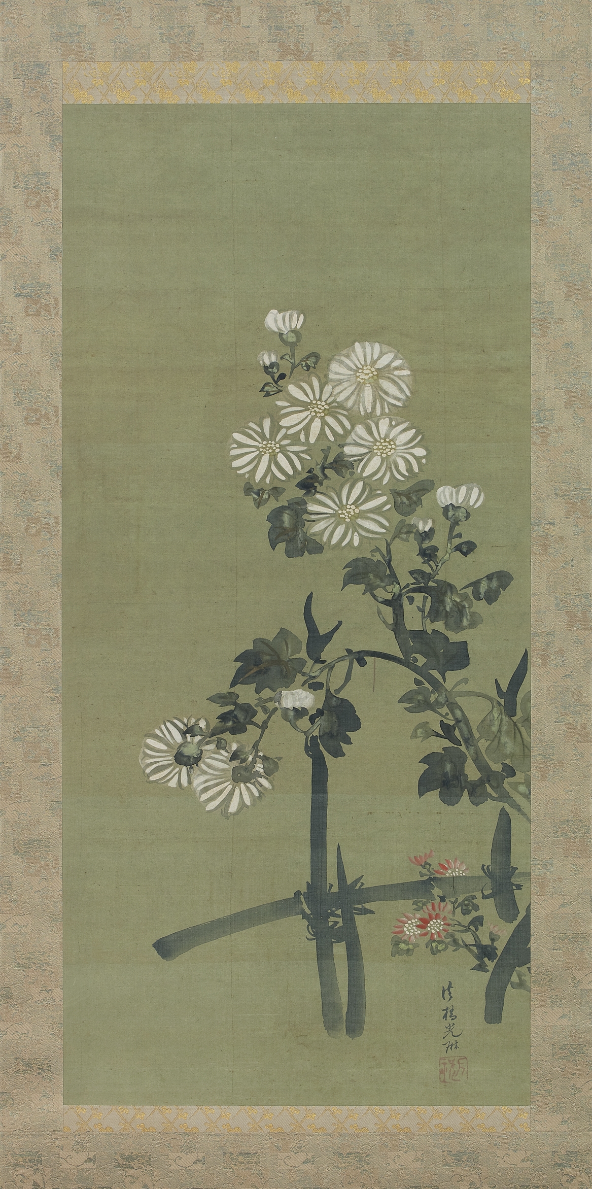 上書院には江戸時代の画家、尾形光琳の「菊図」を展示。また月替わりで秘宝を特別公開していく企画「柳谷観音寺宝展 十一月」では女流日本画家・広田多津の「紅菊」を展示します。