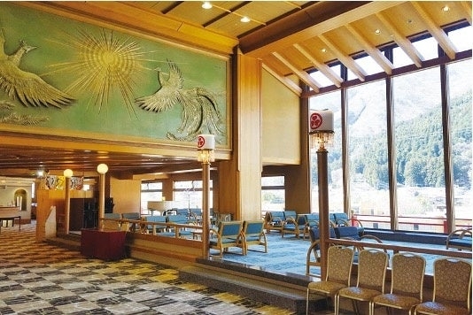 ラジオ体操を開催するロビーラウンジ。大きなガラス窓向こうに鬼怒川の清流を望む清々しい雰囲気の中で、