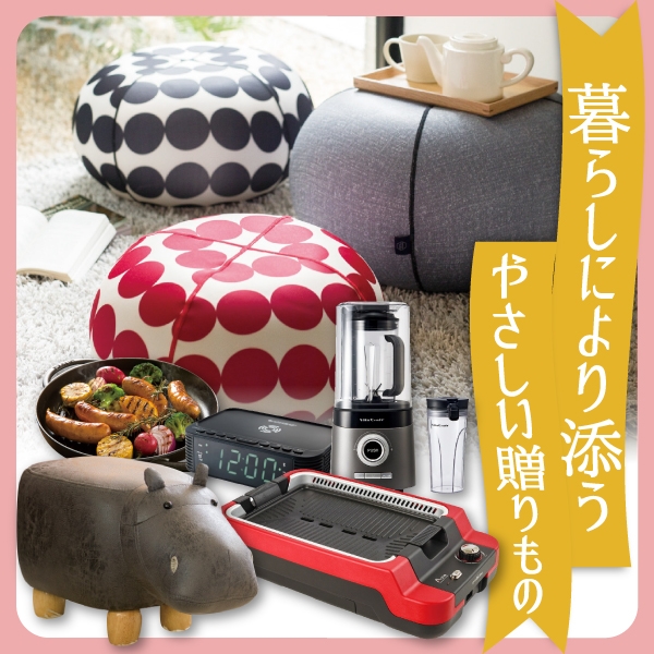 各種お祝い、プレゼント、内祝い・お返しもの、景品・記念品など、あらゆるギフトニーズに対応する、生活雑貨、キッチン用品、インテリア、家電、ファブリック、食品など幅広い商品構成となっています。