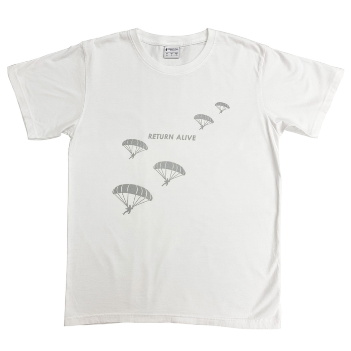 「Return Alive」はホワイトの1カラー。降下する5つのパラシュートに、危機からの脱出と生還がシンプルにデザインされている。新天地へのランディングから、新たな希望が芽生えることを願っての作品だ。