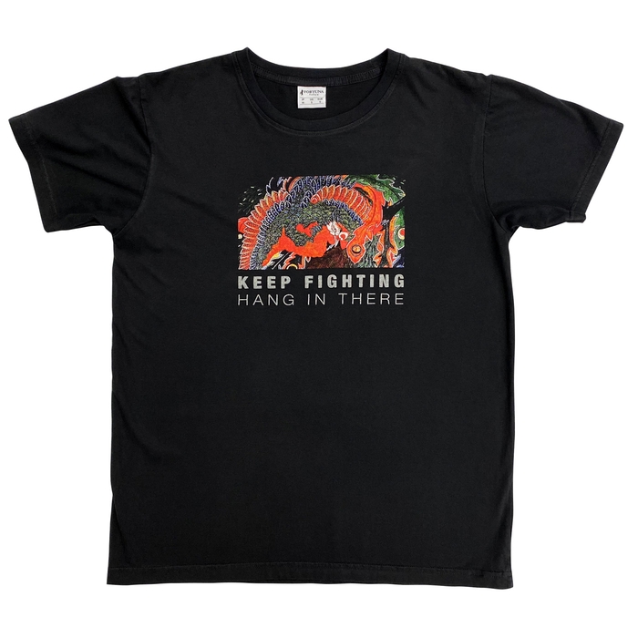 「Keep Fighting」はブラックの1カラー。江戸時代に活躍した浮世絵師、葛飾北斎の鳳凰図が睨みを利かせる。吉兆をあらわす神獣の図には、コロナ禍に立ち向かう人々を鼓舞するストレートなメッセージが続く。