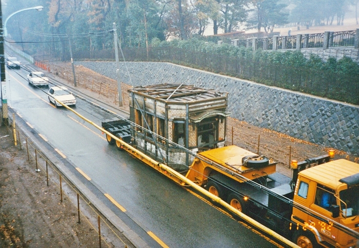 煉瓦造りのように素材を積み上げて組んだ構造を「組積式(そせきしき)構造」と呼びます。組積式構造の建築物は、木造建築のように分解して運ぶことができないため、移築は難しいとされます。そのため建物を丸ごと移動させる「曳家(ひきや)」が有効とされています。「万世橋交番」も煉瓦造りのため、屋根を外して、内部設備を取り除いた上で、鉄骨で補強して丸ごとトレーラーに乗せて運ばれました。建築物としては小ぶりだからこそできた手法です。