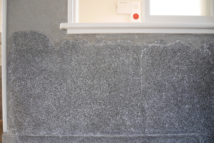 2、各室の腰壁や宿直室の流し台は、現状の仕上げの下に、大理石風の研ぎ出し仕上げが見つかりました。①通常、研ぎ出し仕上げの上にさらに別の仕上げはしないこと、②研ぎ出し仕上げの腰壁に大きな亀裂が見つかったこと、から推察すると、過去のどこかの時点で亀裂が入り、それを保護して美観を維持するために現在の仕上げが施されたとみられます。