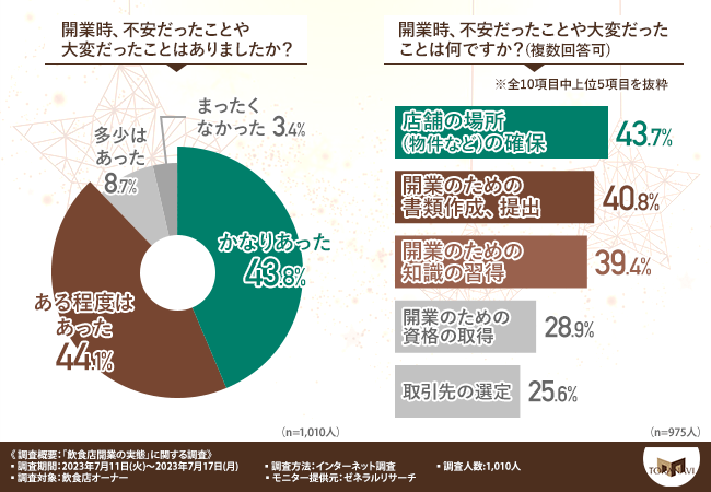 約9割の飲食店事業者が開業時に不安の声。一番の不安は店舗物件の場所の確保