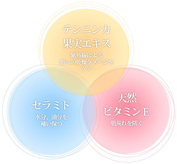 屋内にいても紫外線ダメージはお肌に蓄積します。テンニンカ果実エキスが紫外線による肌への乾燥ダメージをケアして、潤いある肌へ導きます。
