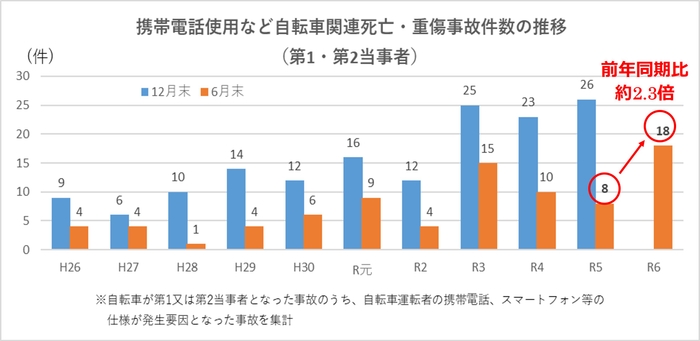 警察庁が7月25日に発表した 「令和6年上半期における交通死亡事故の発生状況」によると、携帯電話等を使用した自転車関連死亡・重傷事故は近年増加傾向にあり、前年同期比で約2.3倍に増加したと発表されています。
