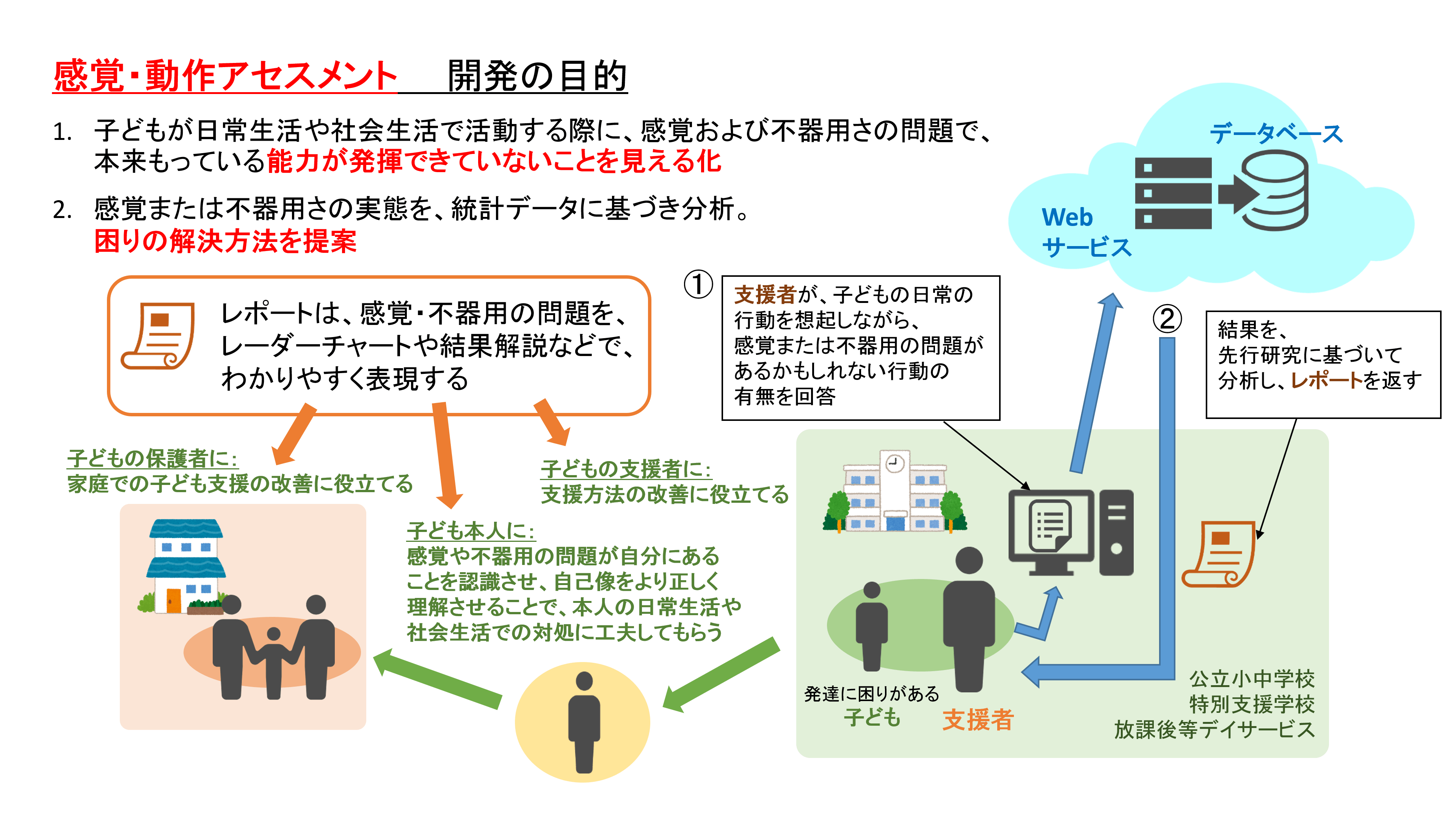 岩永 竜一郎・長崎大学大学院医歯薬学総合研究科教授と多数の研究者(後述)は、学校教師などの協力の下に1,000近くの事例を集め、統計的な調査分析を行いました。そこから導き出された知見を元に、レデックス株式会社はシステムを開発し、学校や放課後等デイサービス、個人を対象にWebサービスを提供することになりました。