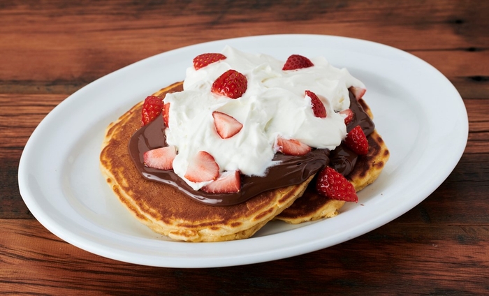サワークリームの入ったパンケーキ2枚重ねに濃厚なチョコレート風味のスプレッド、ホイップクリーム、苺をトッピング