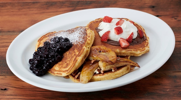ヌテラパンケーキ、ソテーバナナとナッツのパンケーキ、ブルーベリーパンケーキの3種盛り合わせ。
