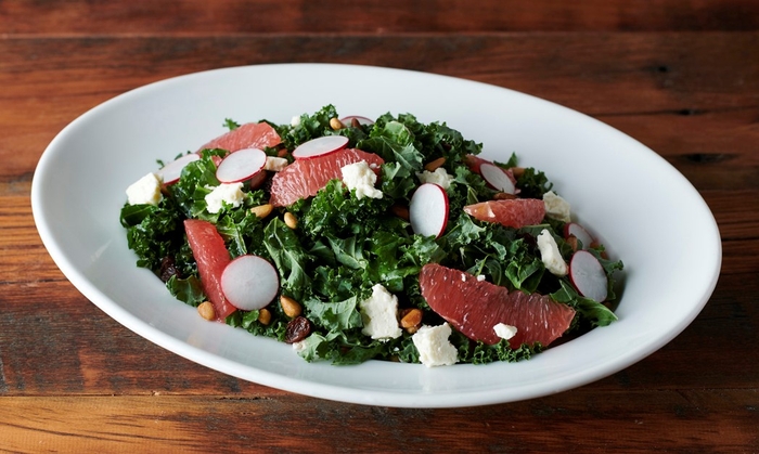 ケール、ラディッシュ、松の実、グレープフルーツ、レーズン、チーズ、ファロをアップルビネガードレッシングで