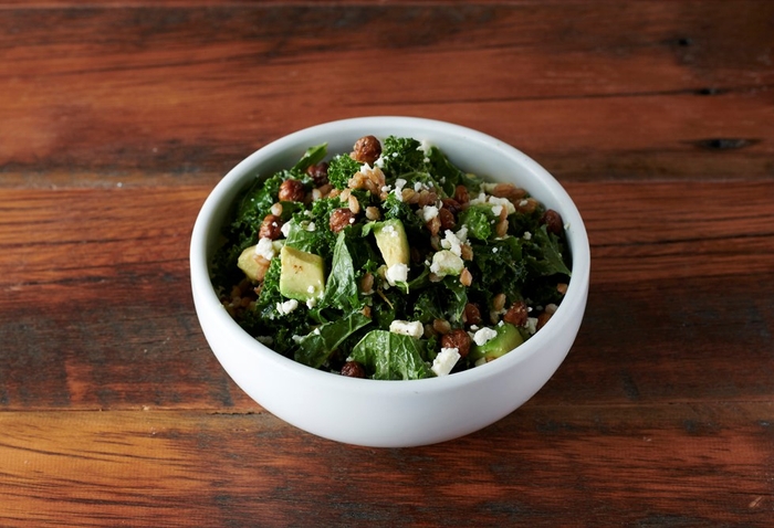 ケール、ロメインレタス、ひよこ豆、アボカド、スウィートポテト、フェタチーズ、ファロ、ミレットをレモンとセサミペーストのドレッシングで