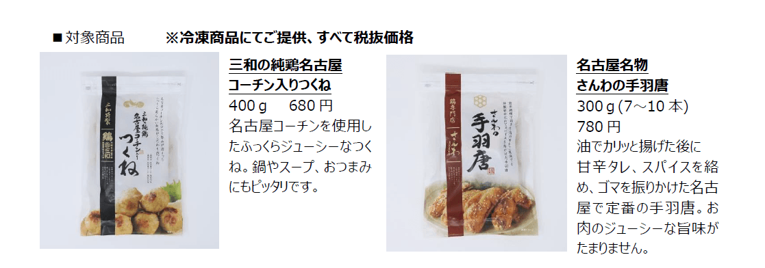 これまで当社では、応援企画としてコロナ禍により影響を受けた生産者や企業の支援を目的に、各地の銘産品を販売してまいりました。今回は全国で“鶏三和”などを運営している “さんわグループ”の「三和の純鶏名古屋コーチン入りつくね」と「名古屋名物さんわの手羽唐」を支援販売いたします。おかずにもおつまみにもできる鶏専門店の味を、ご家庭で簡単にお楽しみいただけます。