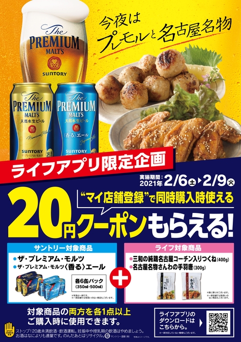 マイ店舗登録をすると「三和の純鶏名古屋コーチン入りつくね」または「名古屋名物さんわの手羽唐」と、ザ・プレミアム・モルツを同時にご購入いただいた際に使える20円クーポンをプレゼントいたします!