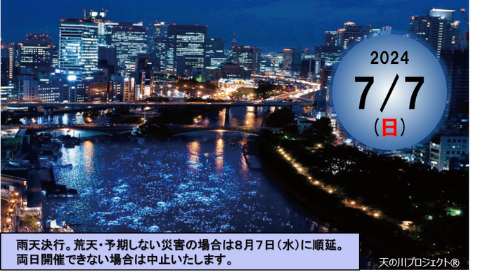 一般社団法人おしてるなにわ(代表理事:加藤好文 京阪ホールディングス株式会社 代表取締役会長CEO)は、2024年7月7日(日)に天満橋・大川およびその周辺(八軒家浜等)で「令和OSAKA天の川伝説2024」を開催いたします。
