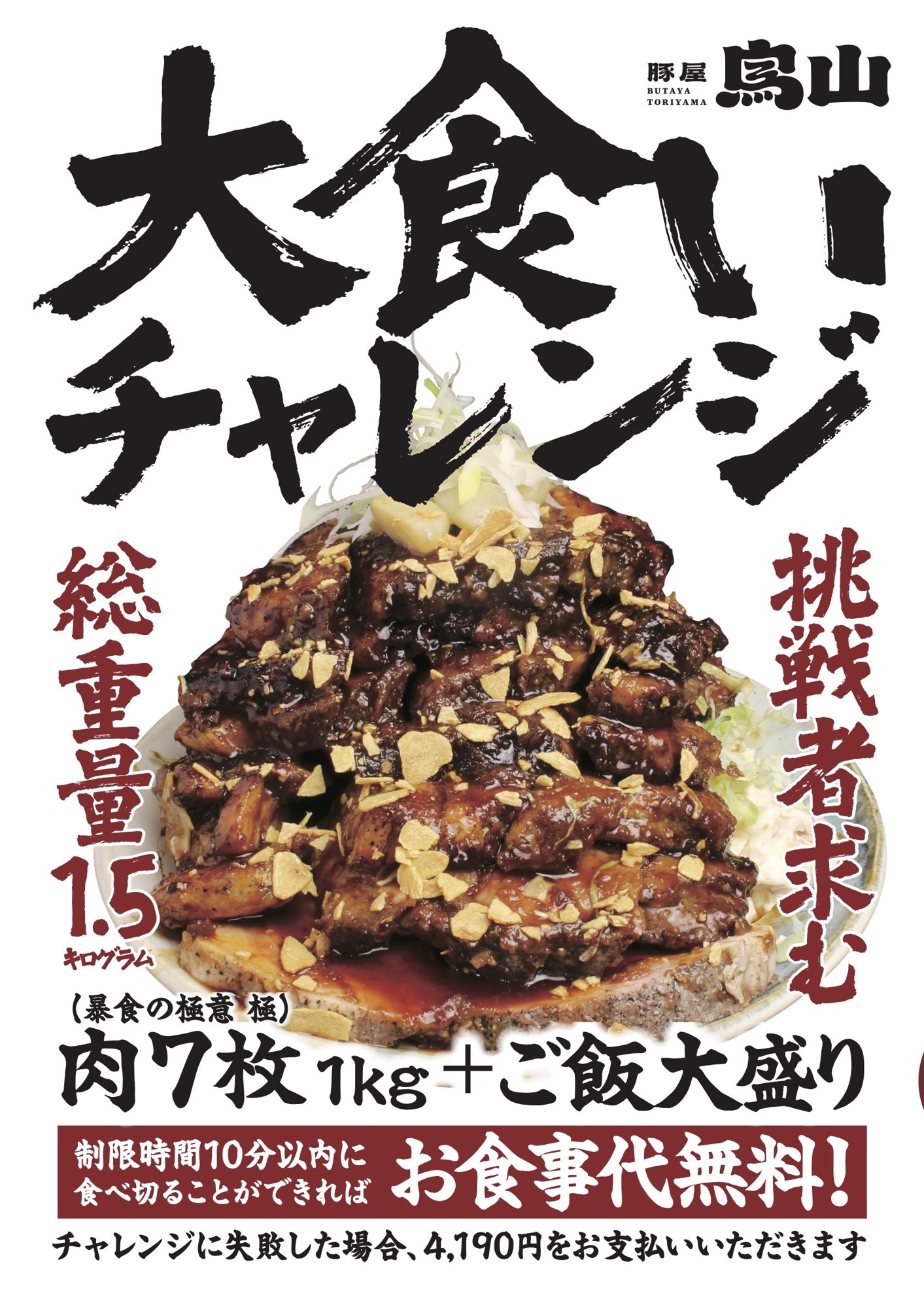 ポークステーキ7枚を重ねたチャレンジメニュー 4,190円。