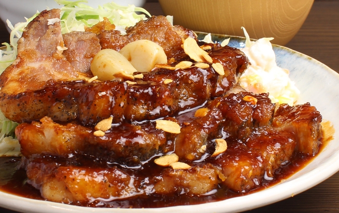 ウスターソースをベースにおろしとロースト、ゴロッとしたにんにくも合わせて三種類のインパクトある味がガツンと効きます。まろやかな酸味が豚の旨味を引き立て、ご飯がとまりません。
