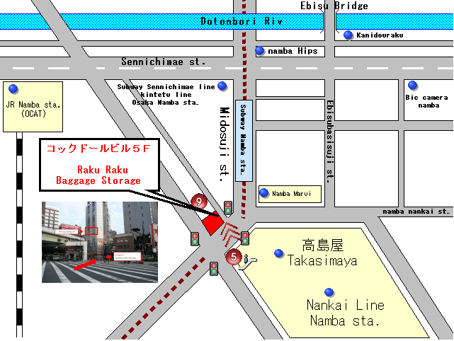 RakuRaku Baggage Storageは南海難波駅より徒歩3分、大阪メトロなんば駅より徒歩1分の場所にあり、外国人旅行者や荷物お預けのお客様が迷うことなくご来店いただけます。