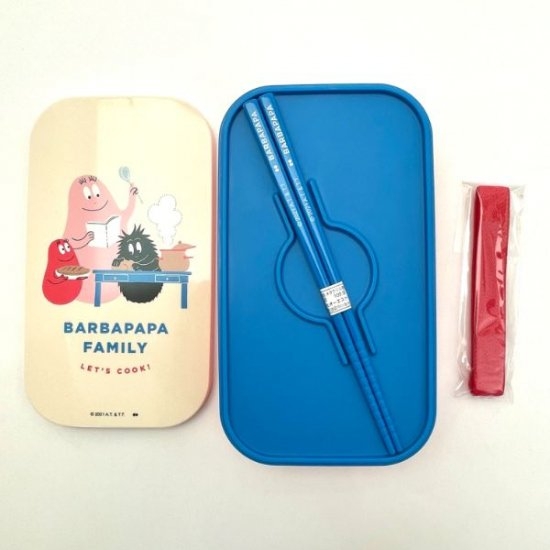 可愛いカラーのカトラリーセット♪フタ部分にはカラフルなバーバパパたちがクッキングを楽しんでいる様子が!