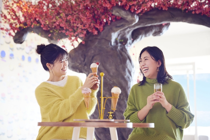 熱海の絶景と温泉に浸るリゾートホテル「星野リゾート リゾナーレ熱海」に、2022年1月6日、梅をテーマに一足早い春の訪れを感じる「あたみ梅カフェ」が登場します。春告げ草である梅をモチーフにした装飾で華やかに彩られた、ホテル最上階のカフェスペースです。目でも舌でも梅を楽しめる「梅ジュースの出る木」や、梅をとことん堪能できる「梅ジェラートプレート」を通して、一足早い春の訪れを存分に感じてわくわくすることができます。