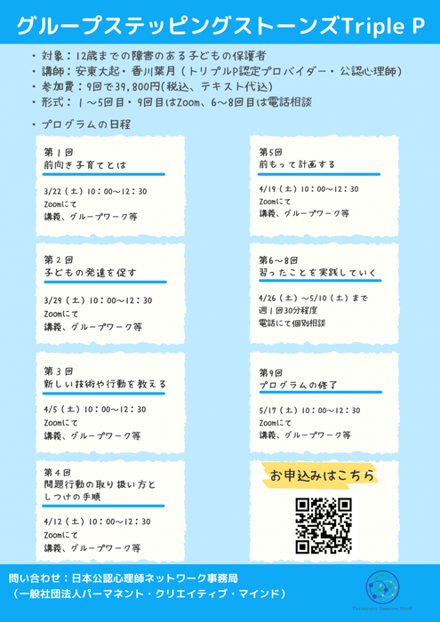 日本公認心理師ネットワークが、2025年3月22日-5月17日10時00分から12時30分まで、『障害のある子どもをもつ親のための前向き子育てプログラム グループステッピングストーンズ トリプル P』というテーマでオンラインセミナーを開催します。