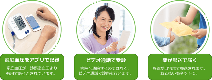 テレメディーズ® BPのご利用者様は、日頃の血圧管理から、診療の予約、薬の受け取り、医療費の支払いまで、自宅や職場にいながらにしてすべてをひとつのアプリで済ませることが出来ます。また、スタッフによるきめ細かなサポートを受けられます。