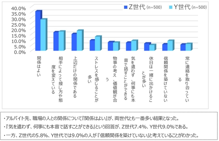 ■設問例 「あなたのアルバイト先、職場の人との関係について、あてはまるものを選んでください。」