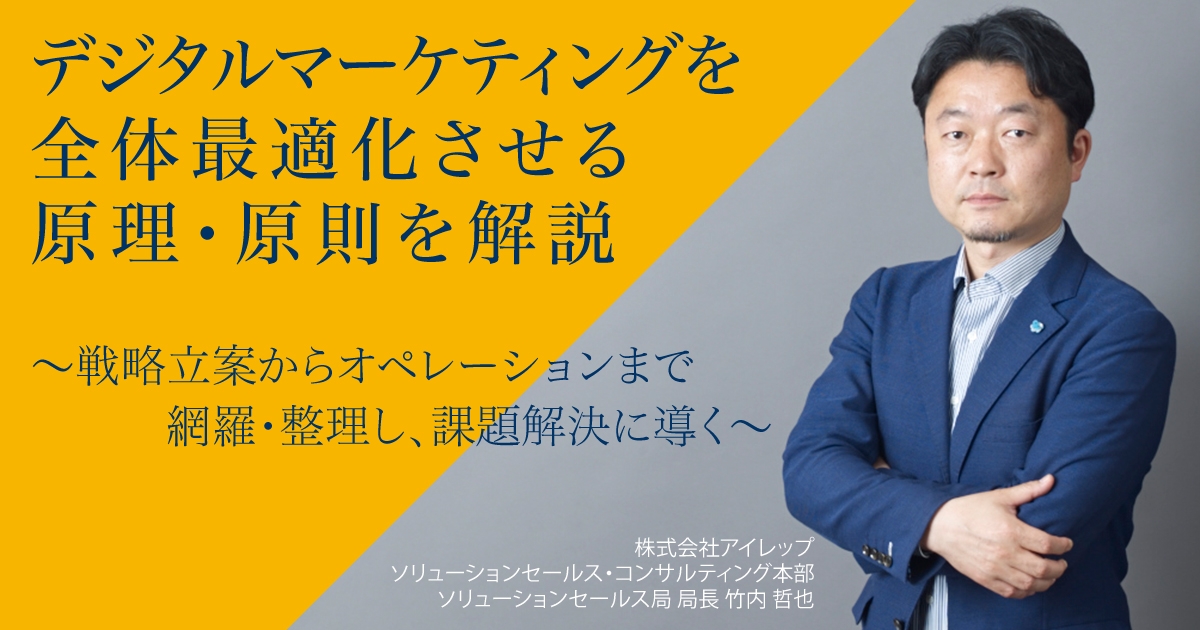 株式会社アイレップ(本社:東京都渋谷区、代締役社長CEO:高梨秀一、以下アイレップ)は、CMO(最高マーケティング責任者)やCDO(最高デジタル責任者)などデジタル戦略の責任者様や広告・Webマーケティング担当者様を対象に、「統合デジタルマーケティング 実践小セミナー」を1月18日(金)、1月25日(金)、アイレップ本社で開催いたします。講演は、アイレップ ソリューションセールス・コンサルティング本部 ソリューションセールス局 局長 竹内哲也が務めます。
