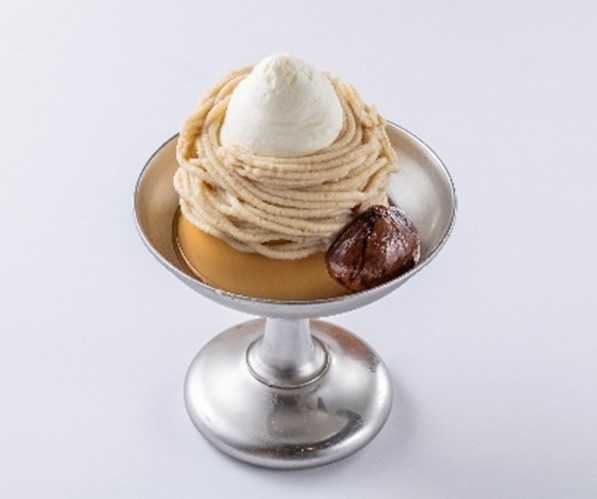 クラシックプリンの上に生クリームと国産和栗ペーストのモンブランクリームをたっぷりとしぼりました。甘栗もトッピング!