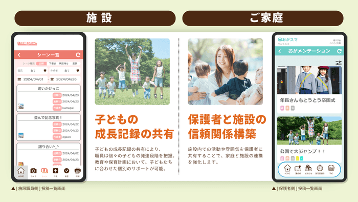 スマートフォンを使いかんたんに「子どもの成長」を共有することや、おたよりやドキュメント作成の手間なく施設関係者だけのSNSで、施設内の子ども達の様子を安心・安全に公開できます。