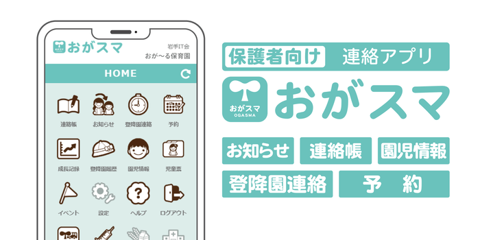 保護者向けスマートフォンアプリ「おがスマ」は教育・保育施設と連携しメッセージを受信したり、欠席や一時預かりの予約・連絡帳のやりとりをする事ができます。