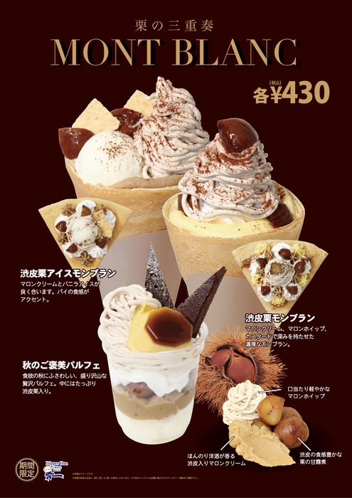 秋の期間限定クレープ、共通トッピングとして「渋皮栗」「マロンホイップ」「マロンクリーム」を使用し、濃厚な秋の味覚を楽しめるクレープに仕上げました。