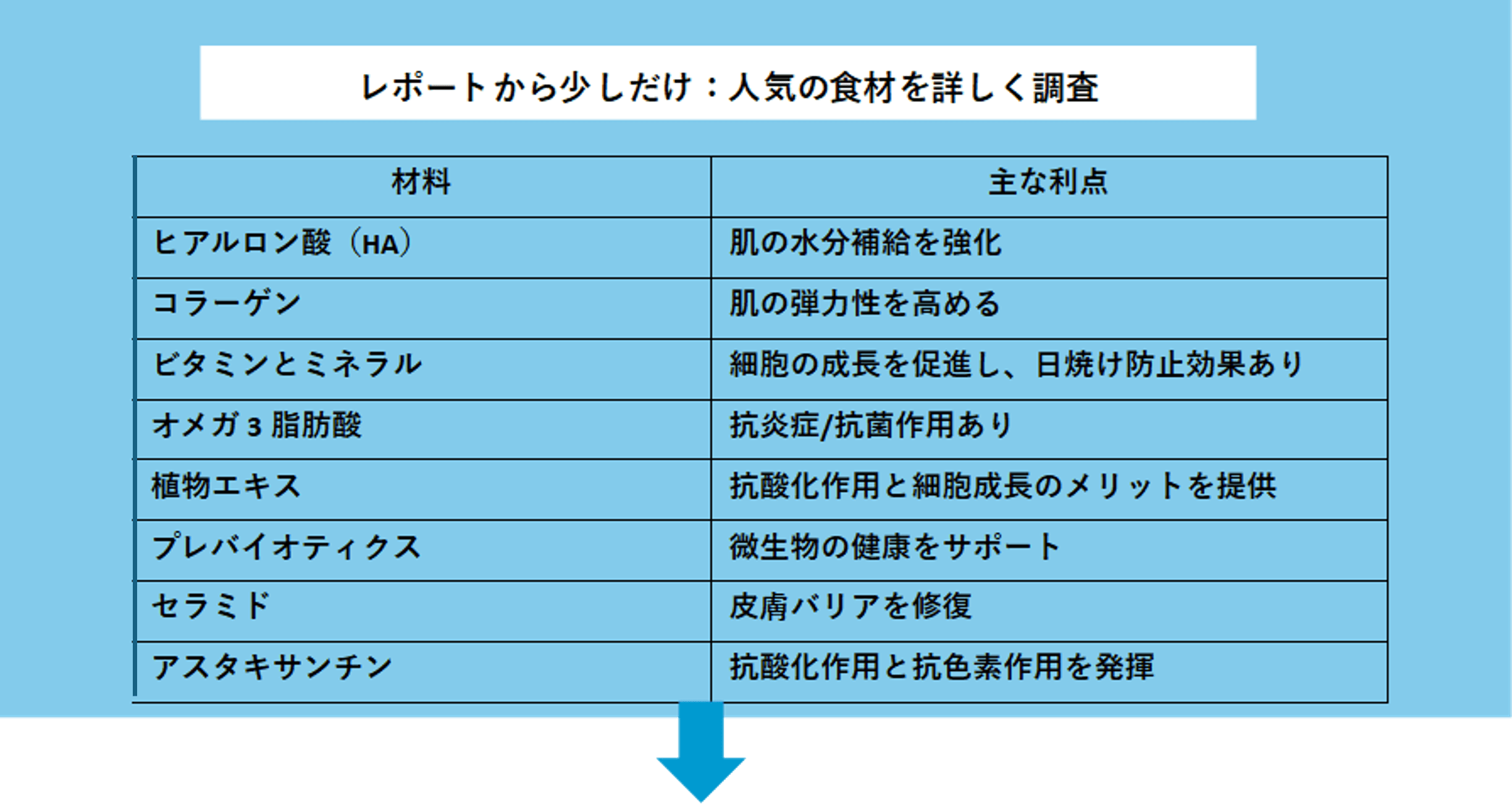 持続可能なイノベーションは、今や消費者にとって重要な需要をもたらします。ブランドは、消費者の倫理的および環境的懸念に訴える「内側からの美しさ」トレンドをサポートする、環境に優しい植物由来の栄養化粧品原料に注力しています。