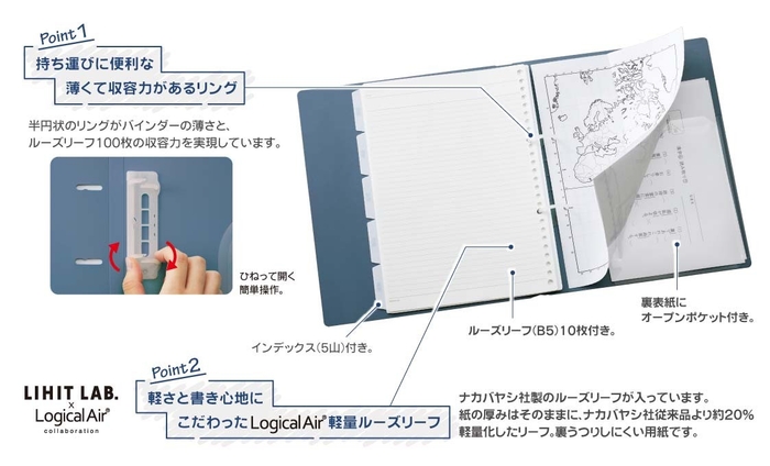 本製品付属のルーズリーフは軽量化されたナカバヤシ社製「ロジカル・エアー・ルーズリーフ」を採用しているので、持ち運びの負担を軽減します。