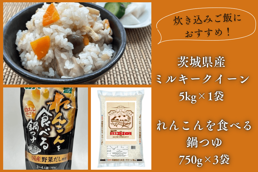 「ミルキークイーン」 5kg×1袋+「れんこんを食べる鍋つゆ」3袋セット
