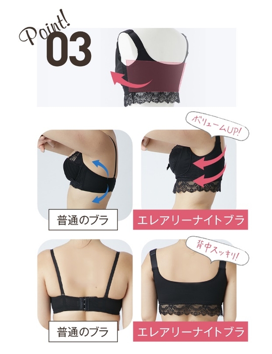 背中から脇の下にかけてのお肉をバスト側へ運ぶことで、背中周りがスッキリします。脇高構造のため、運んだお肉をバスト側でキープします。