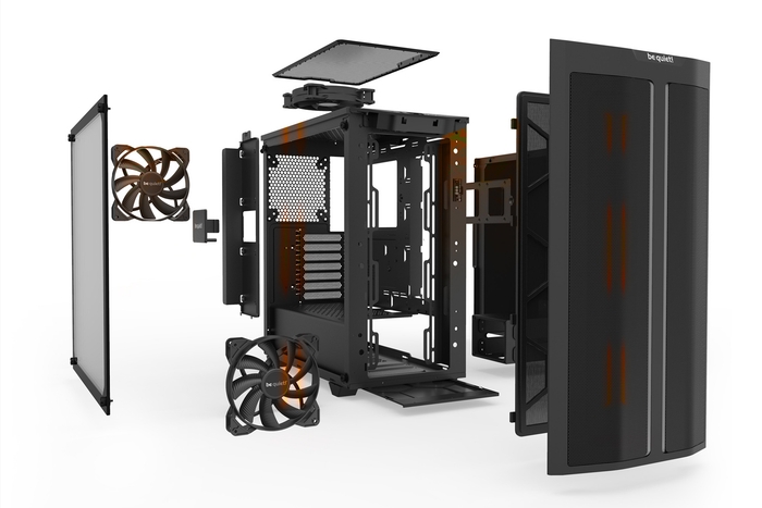 前面と背面、上面には、それぞれbe quiet!製140mm角冷却ファン「PURE WINGS 2」を搭載しています。このファンは単体でも販売されている人気モデルで、エアフローが最適になるように設計された独自フィンを採用し、大風量を実現したほか、回転数が900rpmと低く、騒音値が19.8dB(A)と静かなのも特長です。