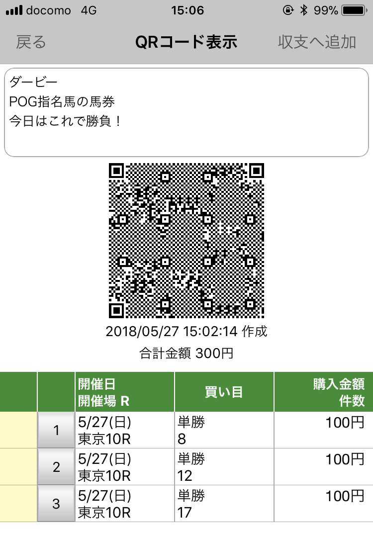 (5) QRコード作成画面にはメモ機能があります。また、買い目を収支に追加してチェックすることも可能です(収支追加機能)。【キメ細かいワザ】