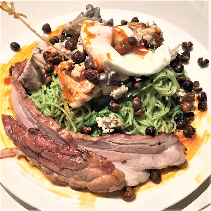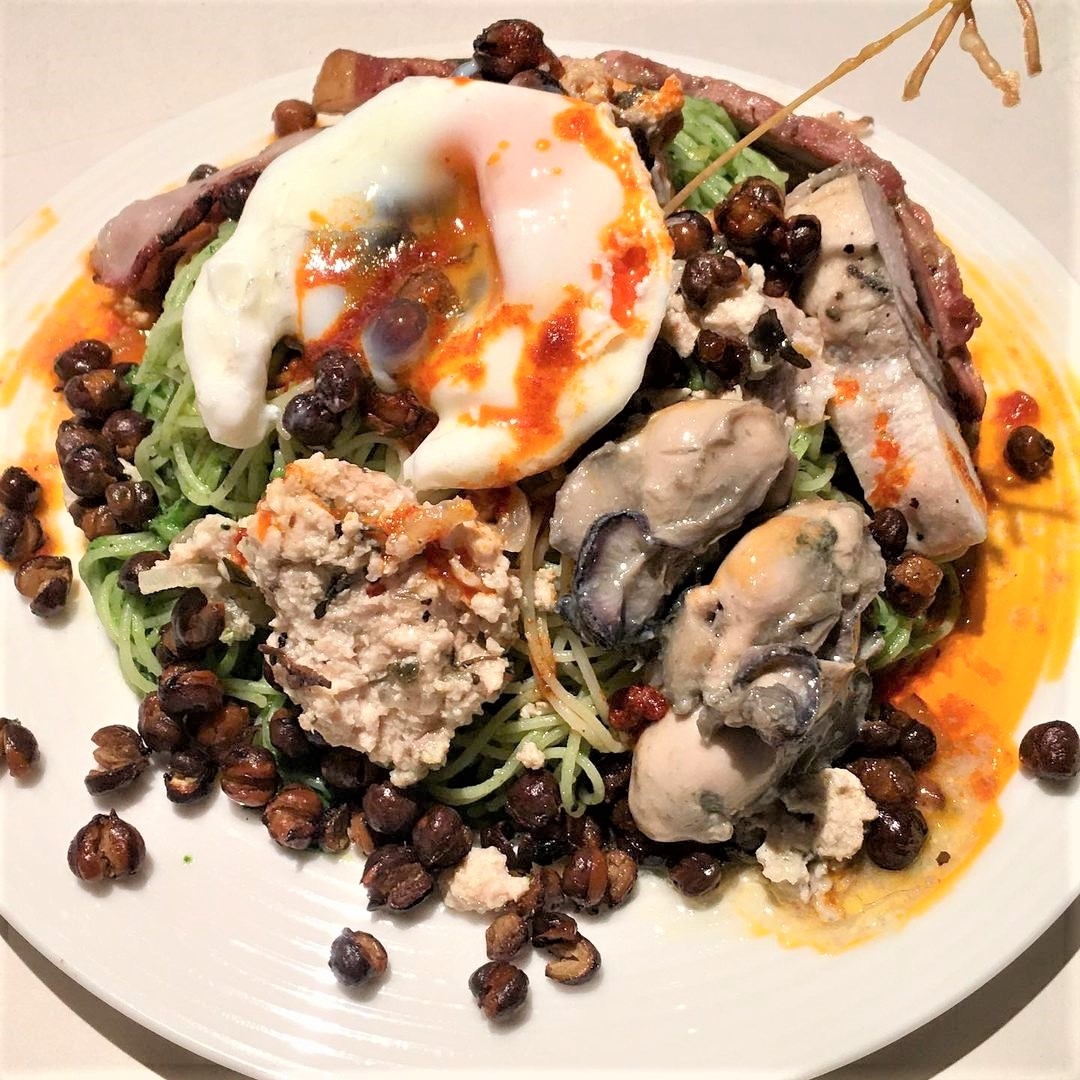 「そこら辺にあるものを作ってもしょうがない」がモットーの岡野シェフによる創作心溢れるエスニックな料理です。メニューはスパゲッティの日もあれば、カレーの日もございますので、ホームページにてご確認下さいませ。トッピングの自家製厚切りベーコンはマストです!