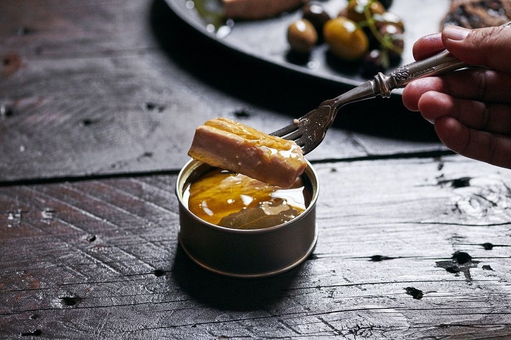 一本釣りした「夏びん長マグロ」のトロの部分のみを、伊産エキストラバージンオイルに漬け込んだ。1ヶ月300個のみの限定生産。