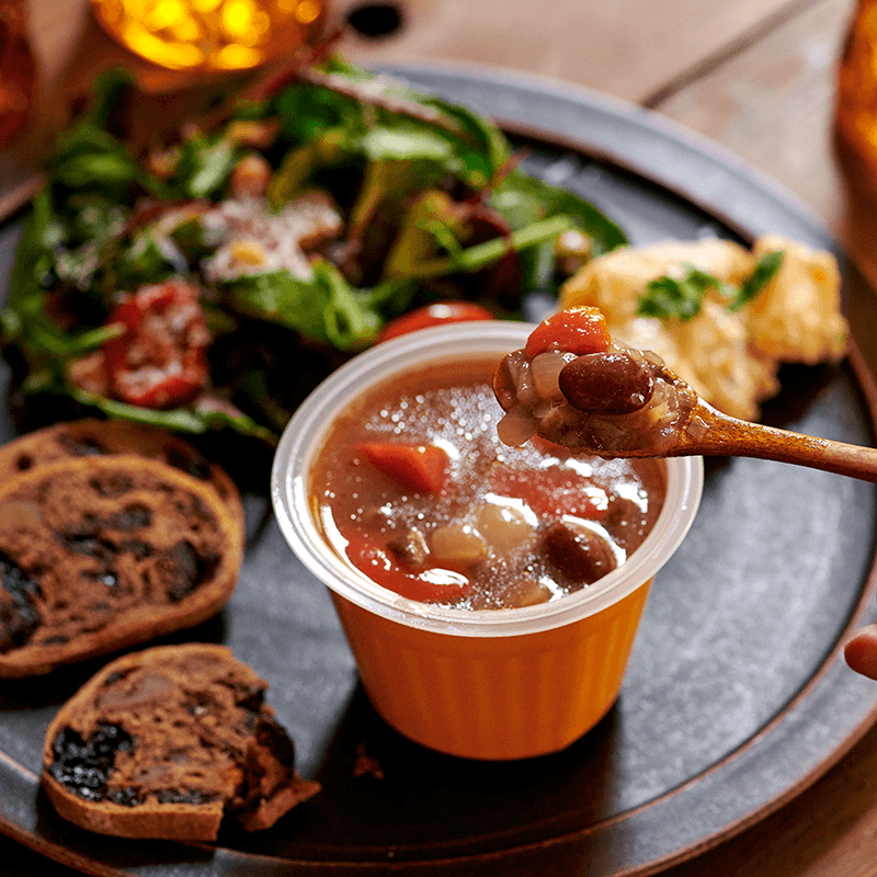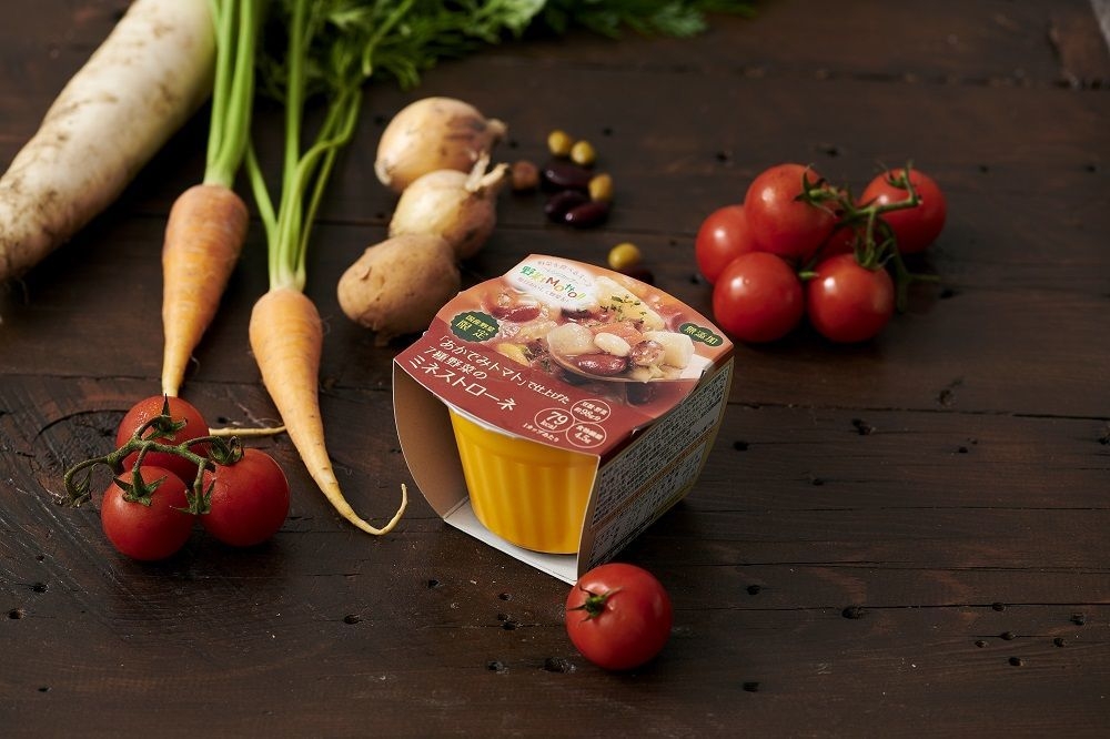 『「あかでみトマト」で仕上げた、7種野菜のミネストローネ』300円(税抜)。国産ブランド野菜をふんだんに使った食べるスープ。常温保存ができるので、ストックにも重宝されます。