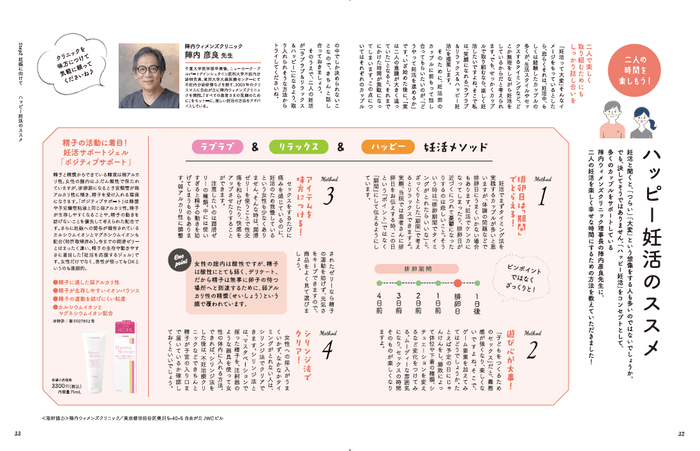 妊活というお互いの心と体を知る絶好の機会を、もっともっと楽しんでもらえるように、正しい知識と情報を誰にでも分かりやすく、そして興味をもってもらえる記事を一冊にまとめました。