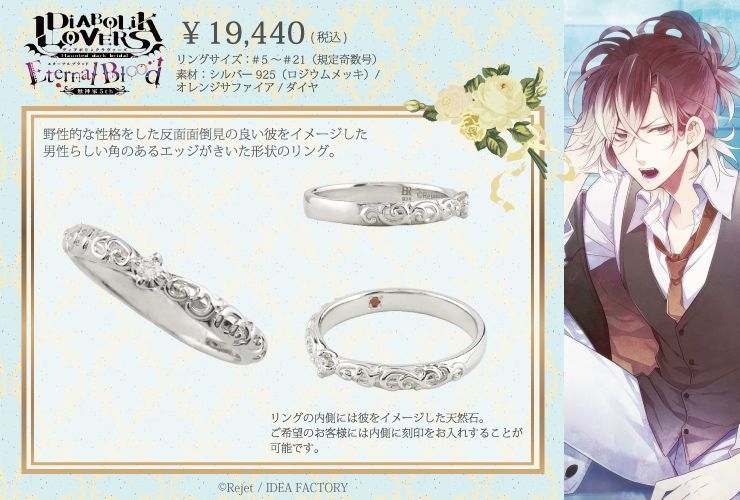 アニメのコラボイベントなどを手がける株式会社エテルノレシ(所在地:千葉県野田市、代表取締役:伊藤 学)は、大人気シチュエーションCD「DIABOLIK LOVERS」シリーズより無神家の登場5周年記念作品となる『DIABOLIK LOVERSドS吸血CD 無神家5th Eternal Blood』の発売を記念したリングを受注生産限定にて発売いたしました。