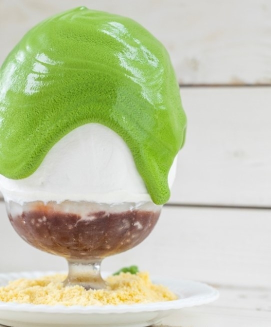 ミルク氷の中に粒あんと大納言かのこ豆、ほうじ茶ゼリーが隠れたかき氷、コクを出すために黒蜜をかけました。最後に、お客様の目の前で濃厚静岡抹茶のエスプーマソースをかけて仕上げます。